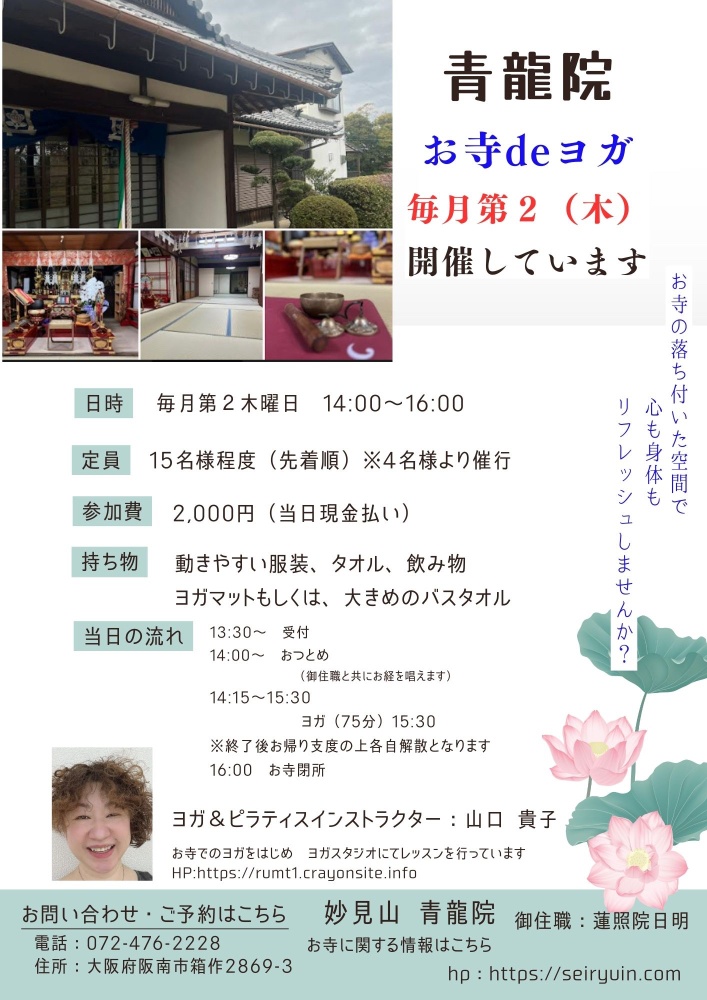 | 持ち物 | 近隣の方は運動できる服装でお越し下さい (更衣スペースはございますが小スペースとなります) ヨガマット タオル 水分 *レンタルマットはございますが 数量に限りがございます。近隣の方はご準備お願い致します。 |